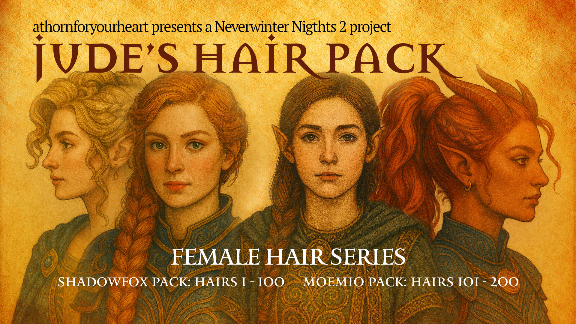 This two-part collection introduces over 200 custom hairstyles designed specifically for Neverwinter Nights 2. Each hair model was carefully assembled and refined in Blender, then individually tested and optimized within NWN2’s engine. These creations represent countless hours of trial, adjustment, and polish to ensure that every style feels natural and immersive within the Forgotten Realms setting.While not every model will be absolutely perfect due to the inherent limitations of the NWN2 engine, each was crafted with the goal of balancing visual appeal, performance, and authenticity. Please approach them with understanding, as these were built with both love for the game and respect for its boundaries.One of the greatest strengths of this collection lies in its shared UV texture system. All hairstyles utilize three universal texture maps, meaning every hair model is linked to the same set of textures. This design choice not only improves in-game performance but also helps reduce overall file size and HDD usage, creating a smoother experience for players and builders alike.These hair packs are a labor of creativity and patience, a dedication to breathing new life into a game that continues to inspire. Whether you are creating a noble elf, a fierce warrior, or a humble commoner, this collection aims to give your characters the individuality and style they deserve.Special thanks to those who supported this despite the setbacks and the amount of times I said "it'll be done soon!"TO NAME A FEW: