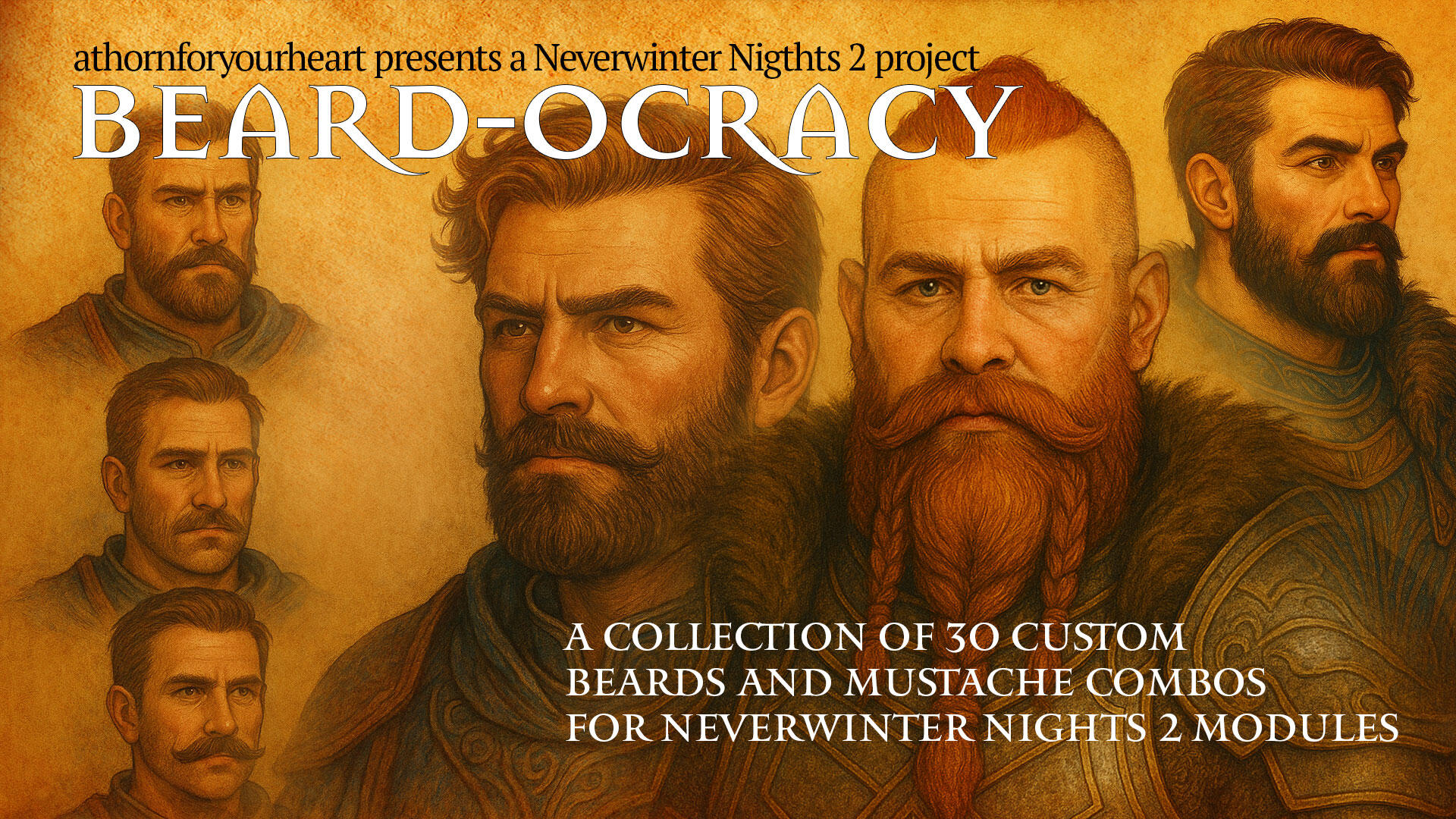 Forged in the heat of creation and tempered through countless tests, this collection brings 30 unique facial hair models to Neverwinter Nights 2. Each beard, mustache, and stubble style was hand-adapted and sculpted to suit the rugged heroes, seasoned wanderers, and highborn nobles of Faerûn.Whether you’re shaping a stoic paladin, a grizzled sellsword, or a brooding tiefling lord, these styles aim to capture that sense of individuality and story. Each strand was refined to preserve shape, silhouette, and realism — striking a balance between high detail and game performance.While three styles were ultimately set aside for poly-limit reasons, the remaining beards have been optimized to deliver mid-poly quality that performs smoothly in single-player campaigns and personal modules. A lower-poly multiplayer edition may follow in future updates for persistent world use.